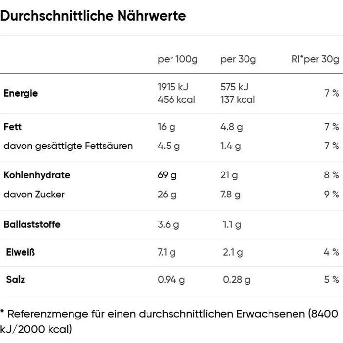 Zutaten: Getreidemehle (53%) (WEIZEN, HAFER, Reis), Füllung mit Schokoladen- und HASELNUSSGESCHMACK (Zucker, pflanzliche Öle {Palm, Sonnenblume, Raps}, Glukosesirup, Schokolade (4%) {Zucker, Kakaomasse}, fettarmes Kakaopulver, SÜSSMOLKENPULVER, MAGERMILCHPULVER, HASELNÜSSE (1%), Emulgator {Sonnenblumenlecithin}, natürliches Aroma), Zucker, Salz, Farbstoff (Annatto Norbixin, Carotin), Antioxidationsmittel (Ascorbylpalmitat, Alpha-Tocopherol).