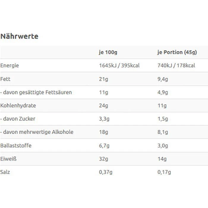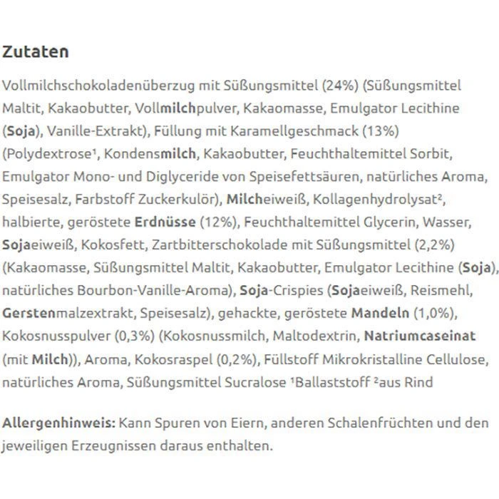 Zutaten:Vollmilchschokoladenüberzug mit Süßungsmittel (24%) (Süßungsmittel Maltit, Kakaobutter, VOLLMILCHPULVER, Kakaomasse, Emulgator Lecithine (SOJA), Vanille-Extrakt), Füllung mit Karamellgeschmack (13%) (Polydextrose¹, KONDENSMILCH, Kakaobutter, Feuchthaltemittel Sorbit, Emulgator Mono- und Diglyceride von Speisefettsäuren, natürliches Aroma, Speisesalz, Farbstoff Zuckerkulör), MILCHEIWEIß, Kollagenhydrolysat², halbierte, geröstete ERDNÜSSE (12%), Feuchthaltemittel Glycerin, Wasser, SOJAEIWEIß, Kokosfett, Zartbitterschokolade mit Süßungsmittel (2,2%) (Kakaomasse, Süßungsmittel Maltit, Kakaobutter, Emulgator Lecithine (SOJA), natürliches Bourbon-Vanille-Aroma), SOJA-Crispies (SOJAEIWEIs, Reismehl, GERSTENMALZEXTRAKT, Speisesalz), gehackte, geröstete MANDELN(1,0%), Kokosnusspulver (0,3%) (Kokosnussmilch, Maltodextrin, NATRIUMCASEINAT (mit MILCH)), Aroma, Kokosraspel (0,2%), Füllstoff Mikrokristalline Cellulose, natürliches Aroma, Süßungsmittel Sucralose ¹Ballaststoff ²aus Rind