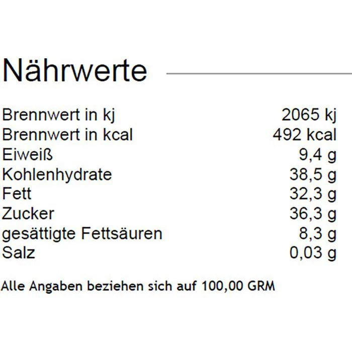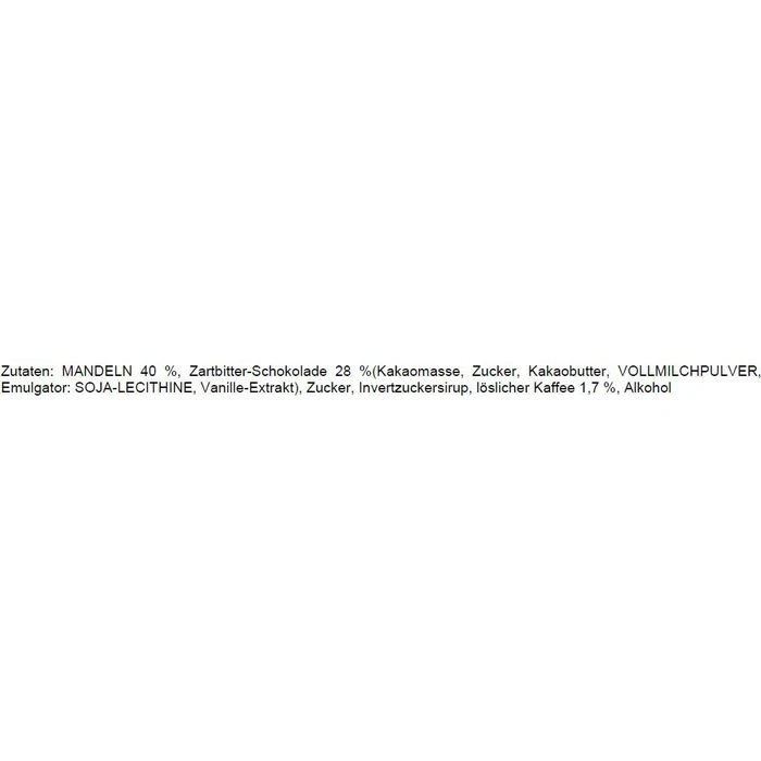 Zutaten: MANDELN 40%, Zartbitter-Schokolade 28% (Kakaomasse, Zucker, Kakaobutter, VOLLMILCHPULVER, Emulgator: SOJA-LECITHINE, Vanille-Extrakt), Zucker, Invertzuckersirup, löslicher Kaffee 1,7%, Alkohol.